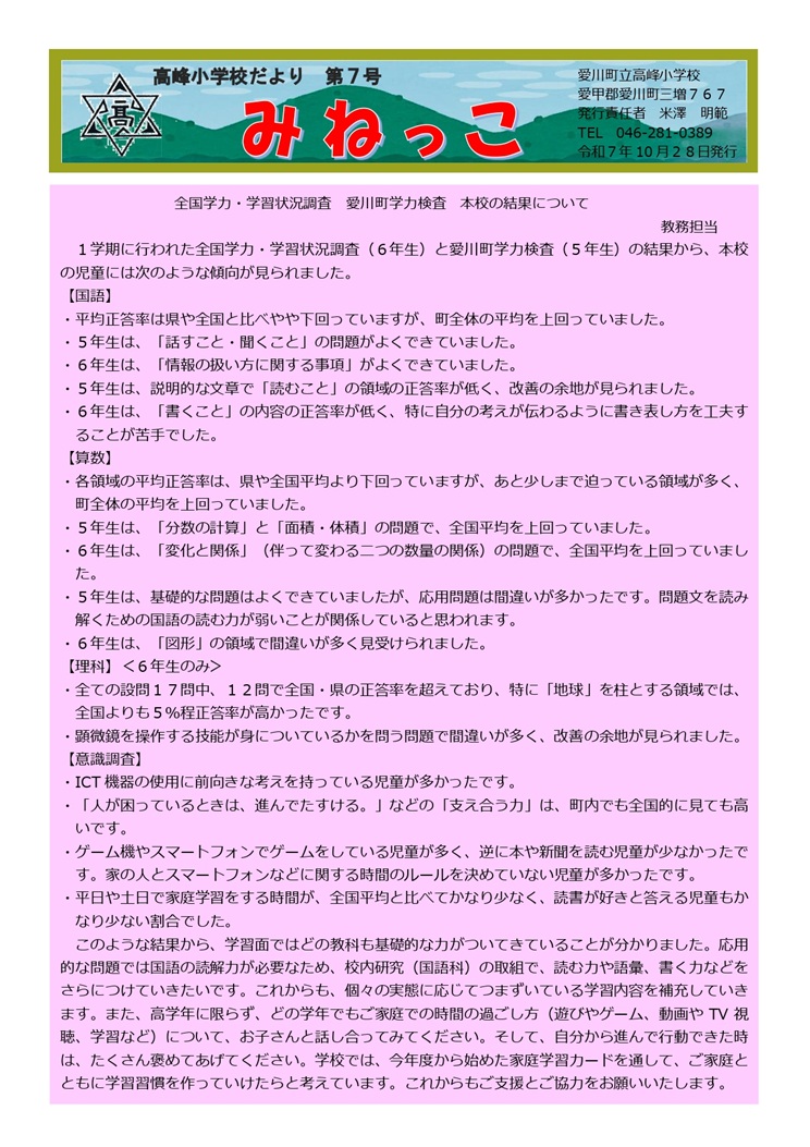 「学校だより「みねっこ第7号」 令和7年11月発行