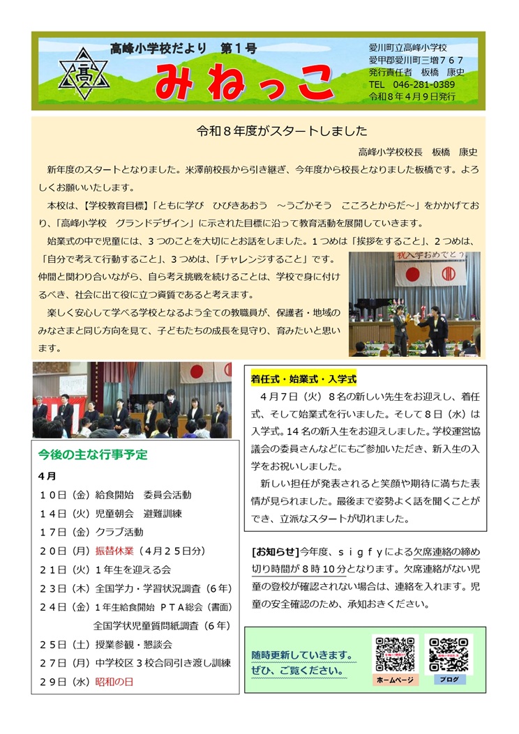 「学校だより「みねっこ第1号」 令和8年4月発行