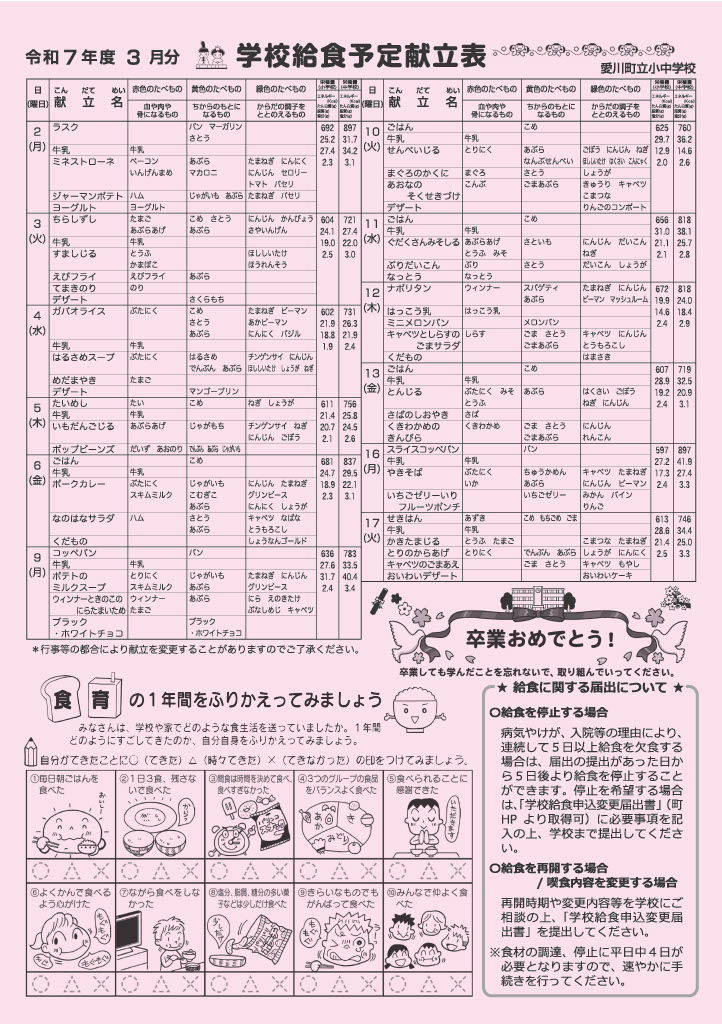 学校給食予定献立表・令和7年度